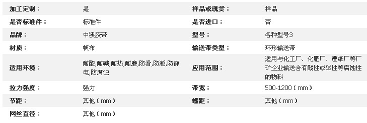 產品特性:選用棉帆布、尼龍帆布或聚脂帆布作帶芯,覆蓋膠采用天然橡膠與順丁橡膠的並用膠、具有彈性高,耐衝擊、耐寒性等特點,能在零下40℃的環境下正常使用。 技術指標: